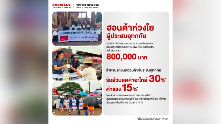 กองทุนฮอนด้าเคียงข้างไทย ผนึกกำลังผู้จำหน่ายฯ ช่วยเหลือผู้ประสบภัยน้ำท่วมฉับพลัน ใน 3 จังหวัด น่าน แพร่ และสุโขทัย ส่งมอบข้าวกล่องและส่งถุงยังชีพ รวมมูลค่ากว่า 800,000 บาท พร้อมมอบส่วนลดค่าอะไหล่ 30% ค่าแรง 15% สำหรับลูกค้ารถยนต์ฮอนด้าทุกรุ่นที่ประสบภัยน้ำท่วมในพื้นที่