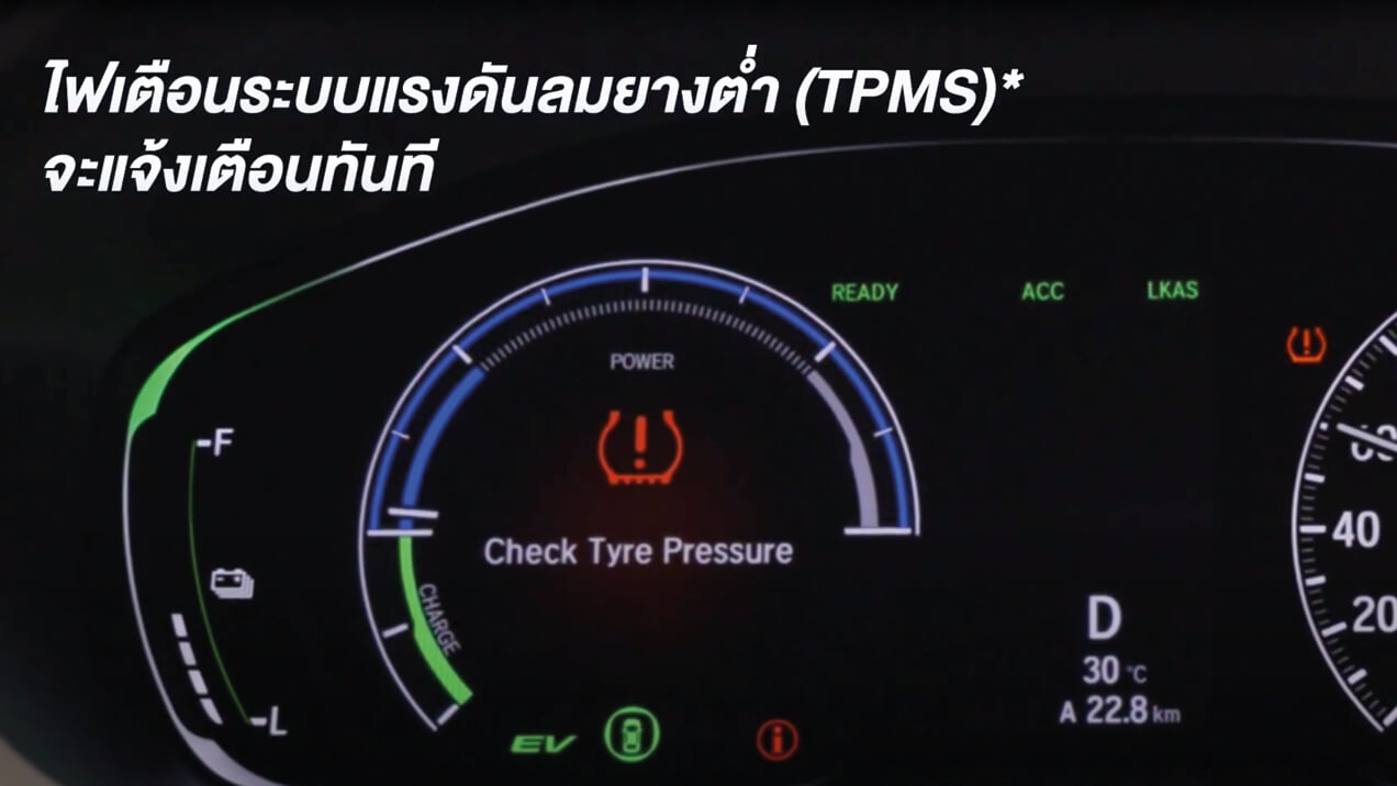 ระบบจะตรวจจับแรงดันลมยางตลอดเวลาที่ขับขี่ และแจ้งเตือนผู้ขับขี่กรณีที่มีแรงดันลมยางผิดปกติ เพื่อให้ผู้ขับขี่ตรวจเช็คลมยาง เมื่อแรงดันลมยางต่ำ ระบบจะแจ้งเตือนบนมาตรวัด TFT ให้ผู้ขับขี่ตรวจเช็กและเติมลมยาง